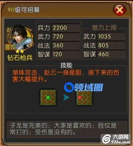 小编点评:赵云普攻犀利,技能都是单体攻击,提高伤害。赵云属于火力输出将,绝技效果还能提高伤害,等级一上去,赵云的攻击秒掉对面不是问题。赵云的普攻非常出色,普攻上来了之后,每次普通攻击相当一个技能攻击,如果敌军有消怒气的武将玩家使用赵云是非常有利的,赵云的普攻扣血能力是妥妥的。