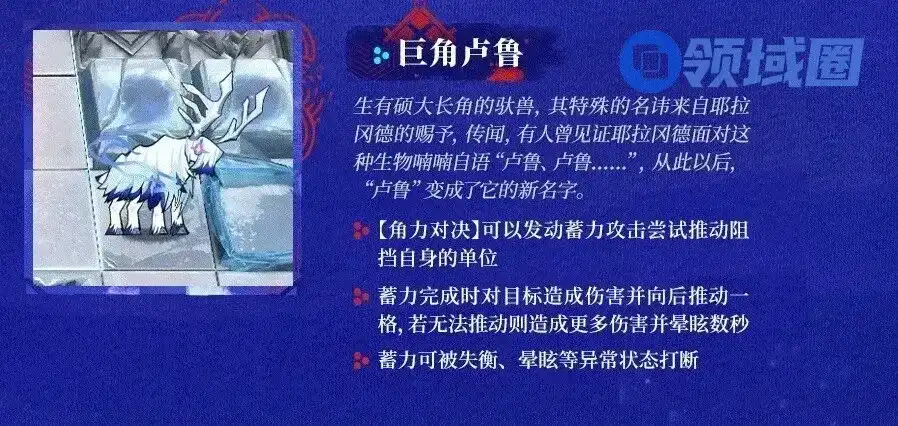 这次还有雪地王八比较有意思,从样子来看就是皮糙肉厚,好在它们撞上高台时失去所有防御力和法术抗性,并无法移动一段时间。巨角卢鲁从名字就能看出来头上的角很大,蓄力完成后可以对目标造成伤害并且向后推动一格,试想一下如果你本来把你的干员部署在雪崩区域外一格的,然后被这哥们顶了一下后就进入雪崩区被带走了,是不是很难受?