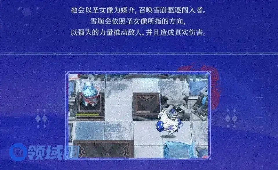 雪崩区的设定就是只要敌人踏入雪崩禁区,雪崩的预警数值便会提升,圣女像的技力也会随之增长。达到一定数值,雪崩就会降临。如何预防雪崩呢?游戏里也有积雪固定装置(存在期间内不会雪崩)和落雪防护装置(自身身后的所有单位不会受到雪崩影响),四个孤星怪的盾牌贴一起就成了新道具,好好好素材这么复用是吧。