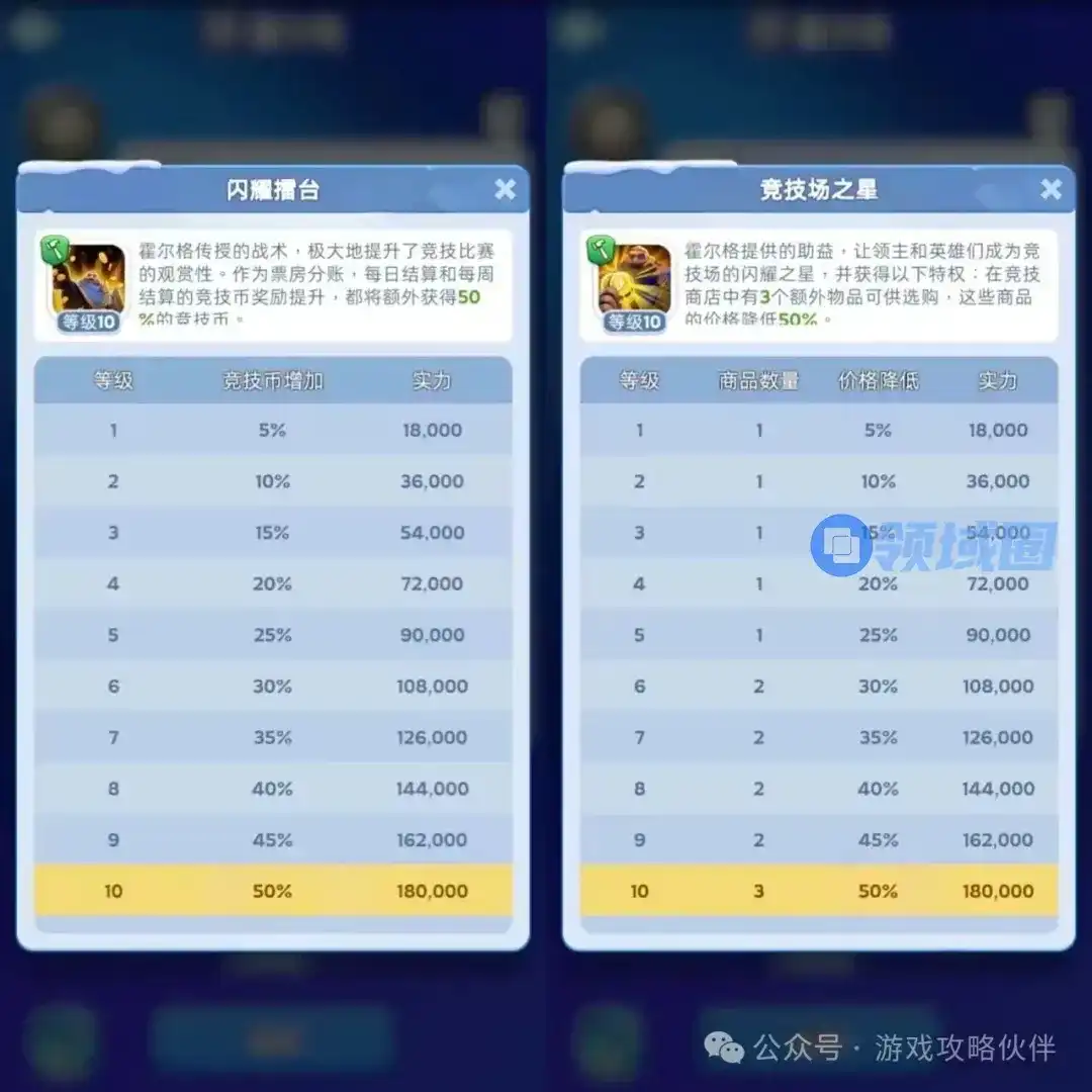 1. 勇冠全场:竞技场内英雄属性+20%。