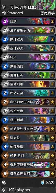 在第一集团里还藏了两个比较冷门的卡组,DH的快攻瞎也是一张不改数据很好。这套过去6小时228场63.2%胜率。
