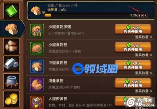 游戏内的空地可以建造三种建筑:农场、伐木场和铁矿场,其中农场生产的是食物,伐木场生产的木材,铁矿场生产的则是铁矿,并且三样建筑都是可以提供对应的物品容量的。如图所示容量:
