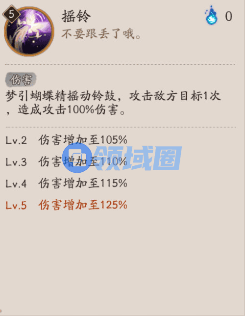 梦引蝴蝶精摇动铃鼓,攻击敌方目标1次,造成攻击100%伤害。