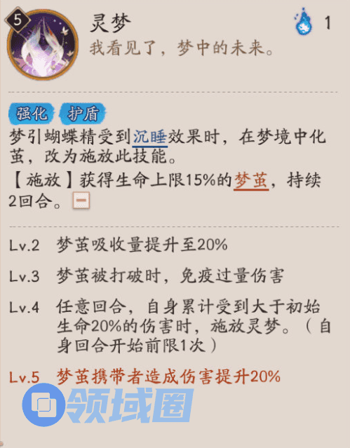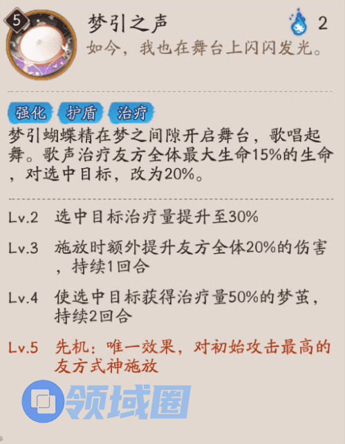 梦引蝴蝶精在梦之间隙开启舞台,歌唱起舞。歌声治疗友方全体最大生命15%的生命,对选中目标,改为20%。
