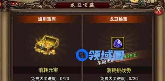 龙卫宝藏分为通用宝库和龙卫秘宝两个战场。通用宝库消耗元宝,龙卫秘宝消耗龙卫挑战券。玩家进入后可以自由选择刷新怪物,刷新怪物需要消耗一定的挑战券或元宝。龙卫宝藏中有很多极品装备,玩家可在界面中随时查看,使用龙卫挑战券获得的奖励会更加丰厚。