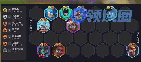 羁绊组成:5暗影岛、3神盾使、3诺卡萨斯、2耀光、2迅击、2征服、