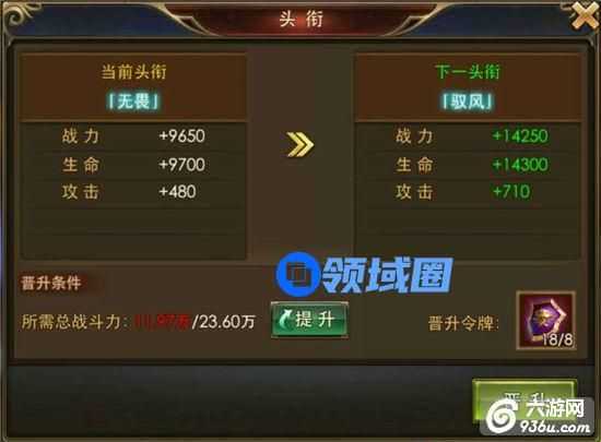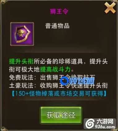 3、头衔的晋升需要两个条件:总战力达标+晋升令牌(狮王令),当玩家战力和狮王令数量都达到后,就可以进行头衔晋升了!作为晋升的材料狮王令,玩家可以通过150+怪物掉落;当然啦,土豪的战力提升太快而狮王令不够时,可以直接去市场购买!