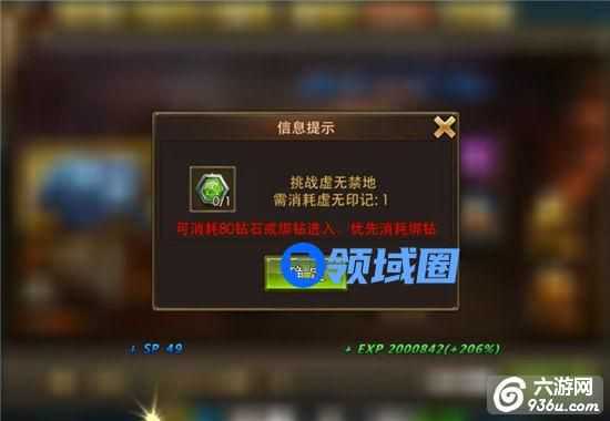 4、每日进入虚无禁地的次数是有限制的(提升vip等级可增加进入次数),而且每进入一次虚无禁地,下一次进入所需的虚无印记就会增加。