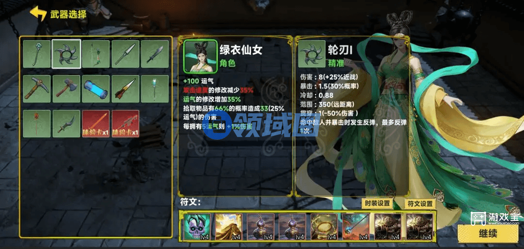 出门带轮刃,前三波优先买武器,刷新只要轮刃,3波之前配齐6把轮刃,最好有蓝色或紫色轮刃。前期要尽量把轮刃升级到红色,因为红色暴击概率最高,伤害输出也有很大提升,最重要的是暴击反弹被动最高有4次。运气:仙女被动伤害吃运气比例,所以前期也要多拿运气,直接能提升伤害。近战伤害:近战伤害是轮刃的基础属性,多刷多拿。暴击属性,越早拿满(查看武器暴击是否100%)被动触发概率越大,伤害越高,清兵能力越强;生命窃取:前期回血主升生命窃取,轮刃被动导致攻击频繁,吸血效率非常高。