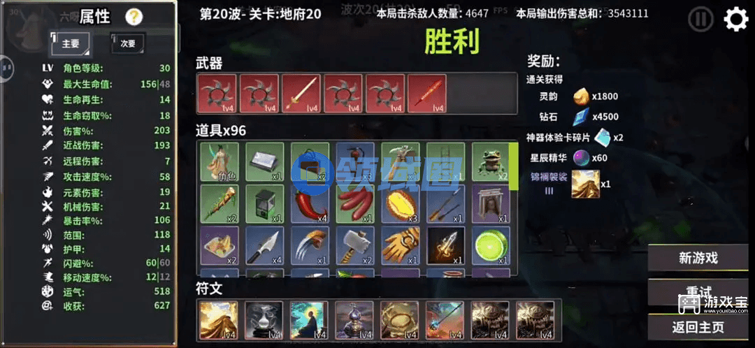 4、核心道具:穿透道具 尖角头盔,反弹道具 网球拍,运气类道具增加被动伤害和资源掉落。