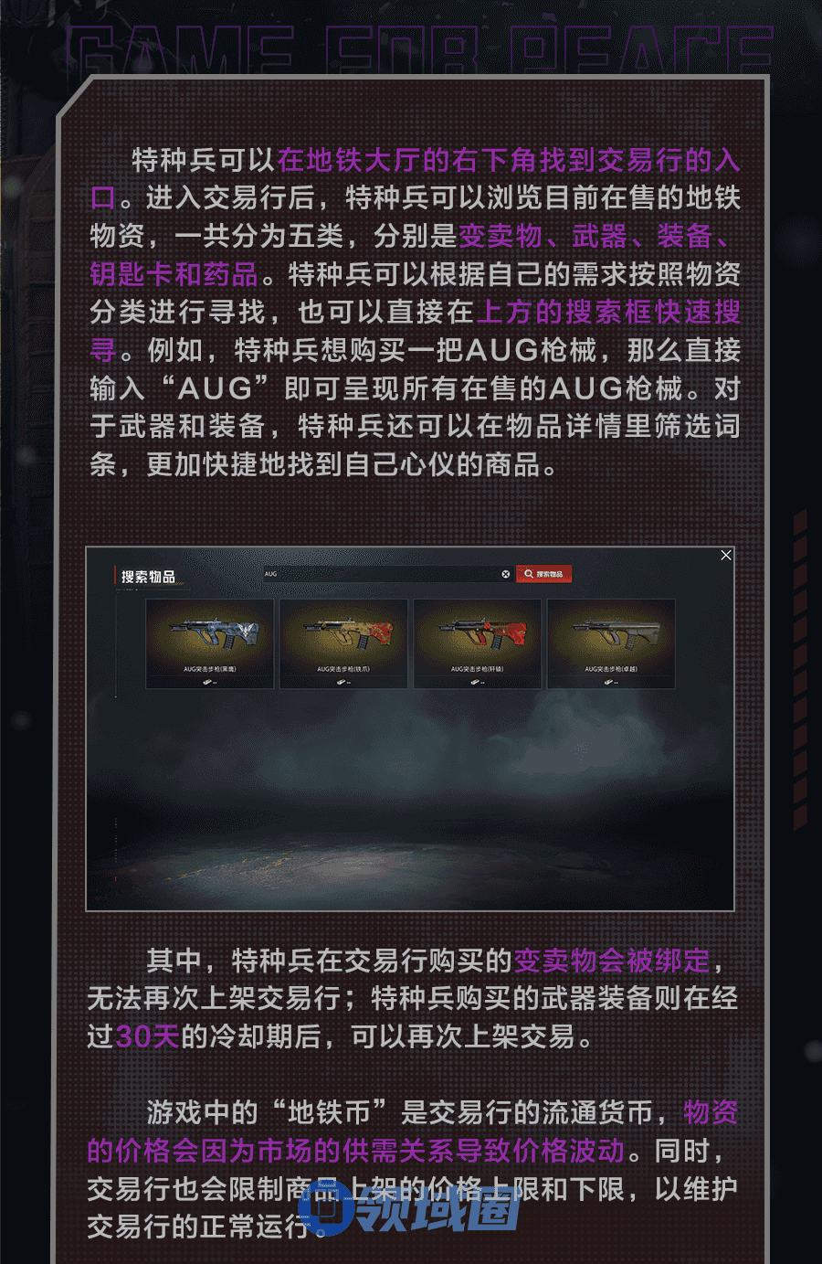 特种兵可以在地铁大厅的右下角找到交易行的入口。进入交易行后,特种兵可以浏览目前在售的地铁物资,一共分为五类,分别是变卖物、武器、装备、钥匙卡和药品。特种兵可以根据自己的需求按照物资分类进行寻找,也可以直接在上方的搜索框快速搜寻。例如,特种兵想购买一把AUG枪械,那么直接输入“AUG”即可呈现所有在售的AUG枪械。对于武器和装备,特种兵还可以在物品详情里筛选词条,更加快捷地找到自己心仪的商品。