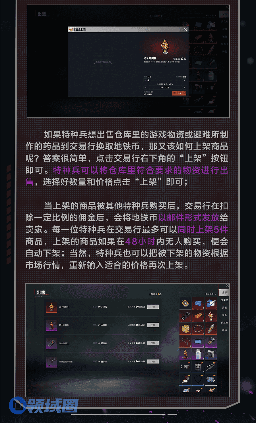 在全新的交易行系统中,特种兵们可以将自己仓库内的变卖物和枪械等物资上架出售,也可以根据自己的需要来购买其他玩家上架的物资。