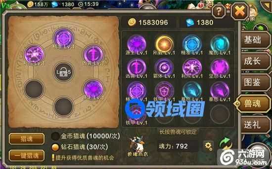 随着宠物等级提升,兽魂魂位逐渐开启,将兽魂附到魂位上,即可加成属性。通过消耗金币或者钻石可以狩猎到宠物兽魂,钻石猎魂会更容易获得优质兽魂哦。