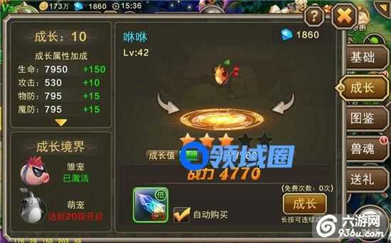 玩家等级30级并完成主线任务后,开放宠物成长功能:消耗成长水晶,就可以对宠物进行培养。成长等级越高,人物获得的属性加成也就越高。成长等级每达到整十级,就会激活一个宠物成长境界,获得额外属性加成的同时,宠物脚底也会出现光圈特效。没错,别人的宠物这么酷炫就是从这里来的。