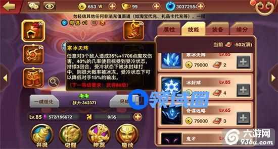 郭嘉的大招呢一直是大家讨论的重点,首先我们要注意到郭嘉的大招,是在武将之间来回弹射8次,这8次是怎么样理解的,就是必须要两名以上相邻的武将才能触发这效果。没错,如果大招攻击的武将附近没有相邻,冰球是不会反弹,也就是只攻击了一次,而不是反弹的8次,这个大家要注意一下。大招也带有受冷效果几率比普攻要高达到了50%,但是是在反弹过程中才会触发的。这个冰冻效果是在受冷状态下,75%几率触发的,被冰冻后无法行动,冰冻效果一般被攻击所打破的,打破时伤害是正常伤害的150%。