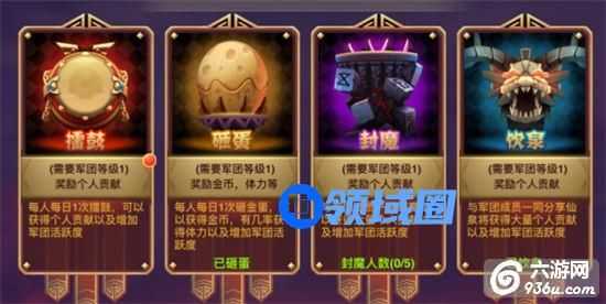封魔:与军团成员一起炼魔可以获得500点个人贡献以及增加军团活跃度。(必须5人站满)