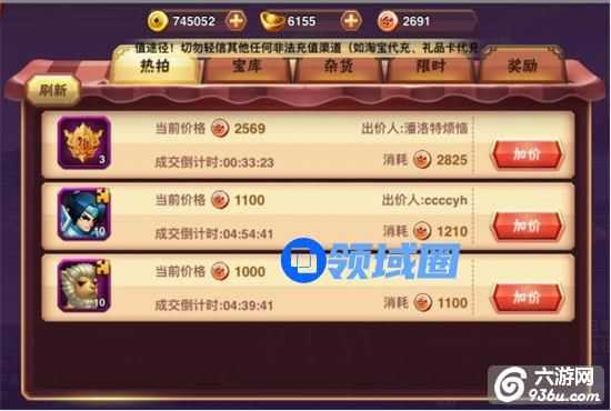 其中热拍与宝库对应的是军团竞赛中BOSS掉落物品的购买,这2个小模块购买的货币就是我们军团竞赛中所得到的命运币,热拍很简单就是拍卖行的意思,所有BOSS掉落物品首先进入该模块由军团成员参与竞拍,每次加价成交倒计时延长30分钟(初始时间5个小时)如果热拍中流拍的商品则会进入到宝库这个模块,军团成员直接兑换。杂货模块对应的货币是军团个人贡献,军团等级的增加商品获得的折扣越低。限时模块则是军团成员支付元宝直接购买打折商品但会有次数限制。奖励模块是军团达到相应等级后军团所有成员通过消耗个人贡献兑换相应奖励。