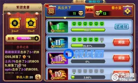 该模块通过帮派之间歼灭魔兽次数来判断输赢,胜利一方将获得大量奖励(补天石、个人贡献、幸运币)败方获得少量奖励(补天石、个人贡献、幸运币),军团竞赛BOSS 分为4个等级,1-4级BOSS 难度以及掉落物品不同,1级掉落(武将碎片、蓝色灵兽碎片、补天石)2级掉落、3级掉落(武将碎片、蓝色灵兽碎片、仙令、命魂碎片)4级掉落(神将碎片、紫色魔纹、橙色魔纹、紫色灵兽碎片)同时军团竞赛时,军团长与副军团长可以选着军团加成国家BUFF,军团成员每天可以进行鼓舞。军团成员每日只有2次攻击次数每次奖励命运币100,累计输出前三名以及击杀BOSS将获得额外命运币奖励。
