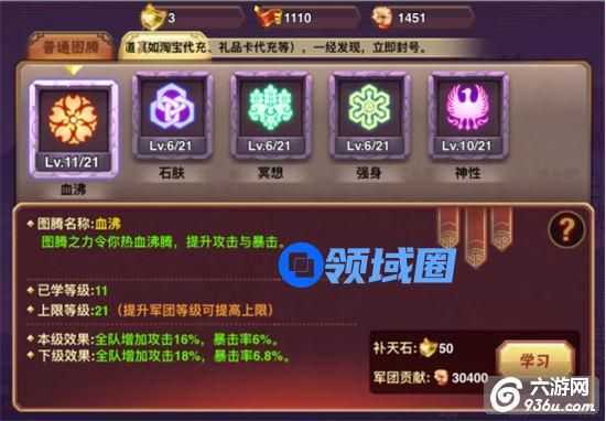 其中高级图腾升级需要消耗:补天石以及大量的军团贡献。(补天石获得方式:军团战)