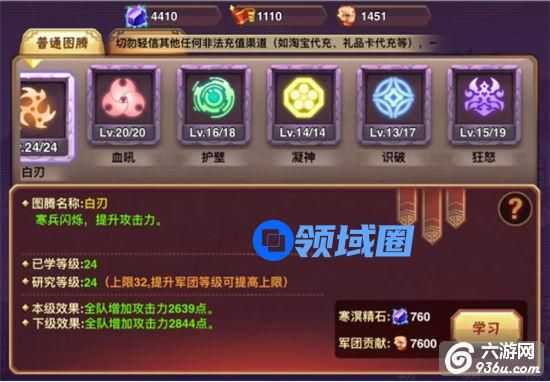 建议大家此模块普通与高级图腾优先升白刃、血吼、血沸、神性。乱斗2战力加成中攻击、气血加成最高其次是输出、暴击、减伤、命中等。