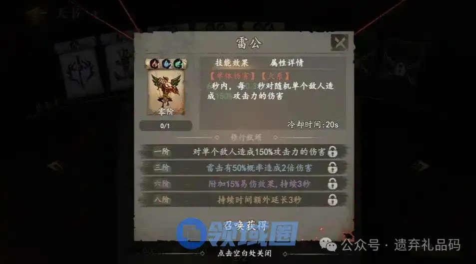 雷公/十绝阵(火):单体伤害,推关只剩最后一个首领时用,平时别带(清杂兵没用)。