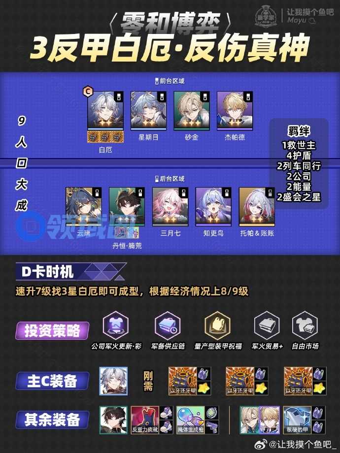 【中期】投资策略优先找装备类,合成3反甲,白厄+护盾体系之外的队员可灵活调整,比如缇宝/刻律德菈等;