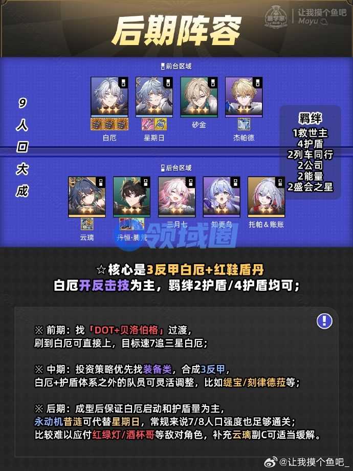 【后期】成型后保证白厄启动和护盾量为主,永动机昔涟可代替星期日,常规来说7/8人口强度也足够通关;比较难以应付红绿灯/酒杯哥等敌对角色,补充云璃副C可适当缓解。