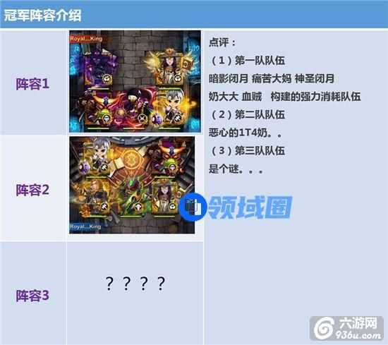 虽然队伍遇到的都是消耗队伍所喜欢的,但依然恭喜能够拿下冠军,也给大家展示了部分暗闭队伍的效果,更多的效果必然会随着玩家暗闭的开启后,更加丰富。本人是比较看好的闭月的3张橙卡。。。牧师套,你快到碗里来。。。刚好自己有戒指的痛苦大妈就不会浪费了,多好的搭配啊。