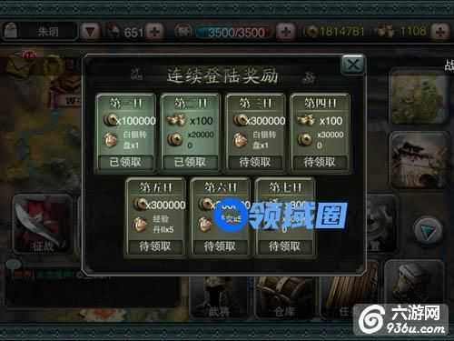 勤能补拙,战场形势必须要时时洞悉。《三国霸王大陆》为每位玩家都准备了丰厚的登陆大礼,除了海量的金钱之外,连续登录还可以领取到大量元宝、珍贵的白银转盘、高级经验丹等豪华大礼,正所谓君子爱财取之以道,不取白不取。