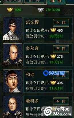 当你觉得不喜欢这个大臣或是其他,可以选择流放某个大臣,但若是要在流放期间内将大臣召回的话,会根据流放期还剩多少来缴纳元宝。