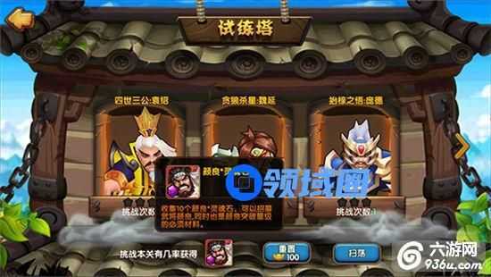 点击进入试炼塔可以看到每一层有3个挑战武将,而每一层都有几率获得一种武将的碎片,试炼塔第一次可以获得颜良,毕竟现在的时代还是要看颜值的,嘿嘿。