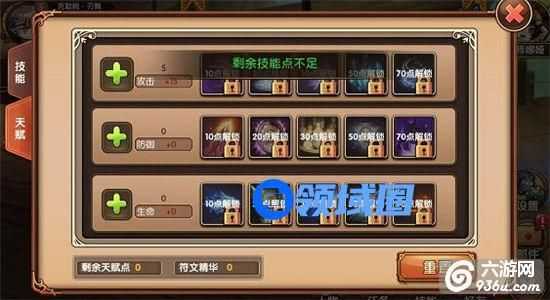 在第二个标签页“天赋”里,可以通过分配天赋点来为角色增加被动属性,而且每点到一定程度还能解锁技能符文唷!可惜现在点数还不够,符文系统就留到以后再了解吧。