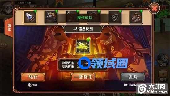 之后就会开启装备强化功能,主角终于可以DUANG一下自己的装备啦!点击右下角的锻造按钮后,再在界面中点强化就行。想强化其他装备的话,就点击上方的图标切换,十分方便。