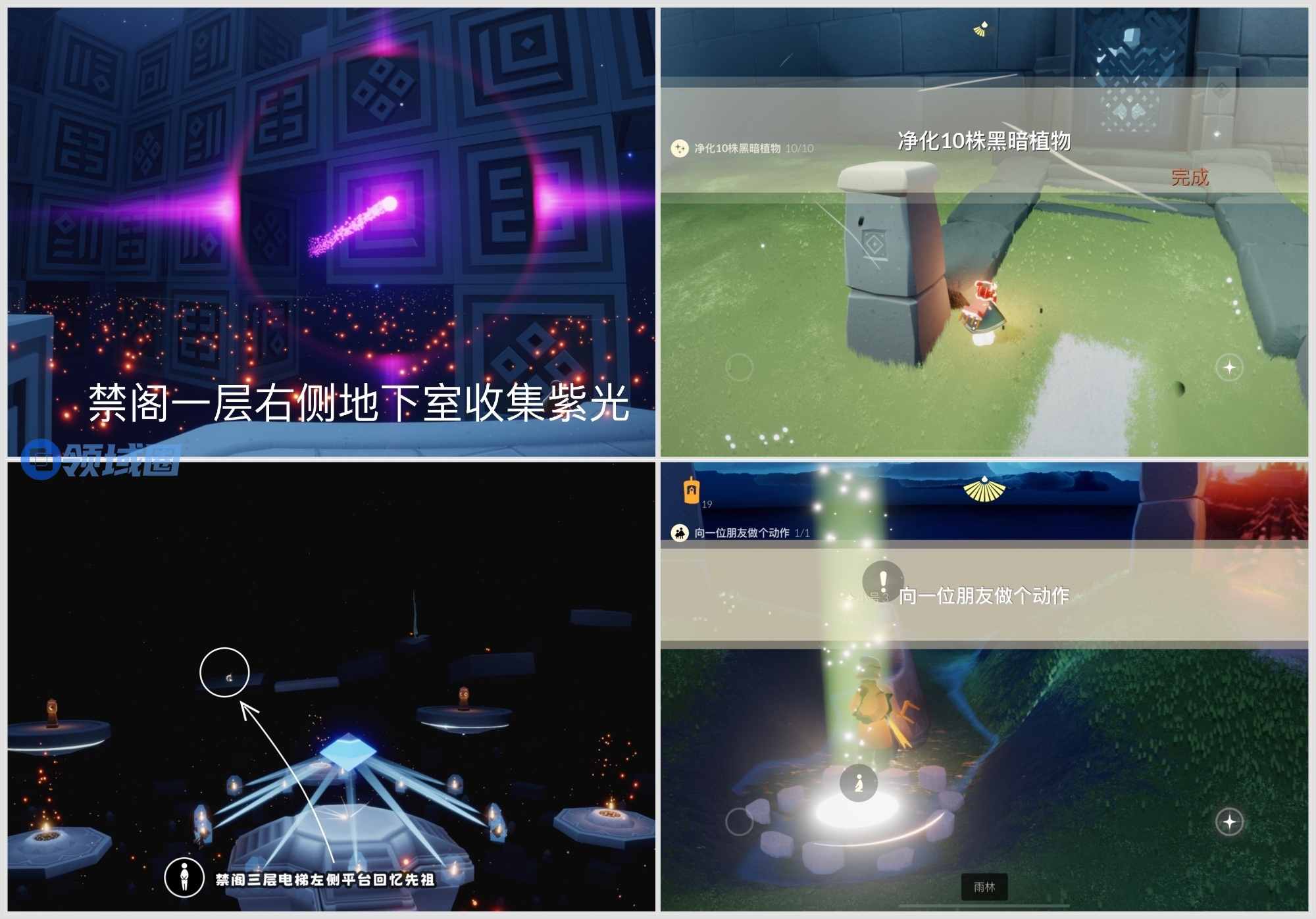 任务①收集紫色光芒:进入禁阁右侧双人门地下室收集紫色光芒即可玩成!