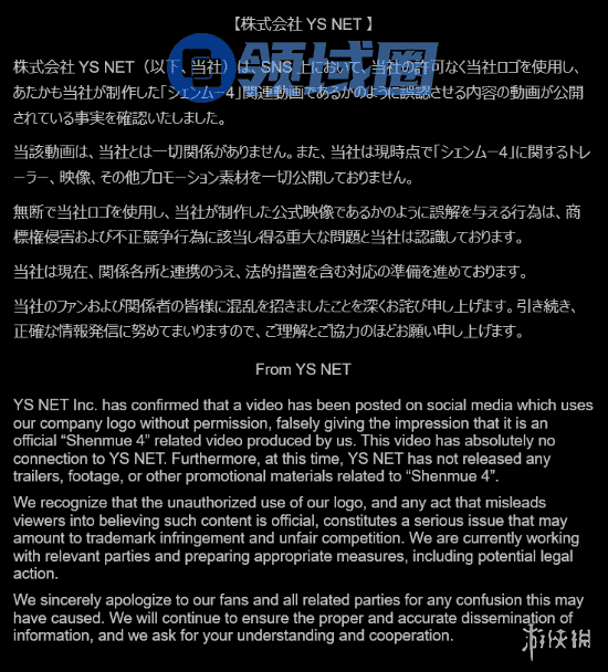 工作室明确强调,该视频与他们绝对无关,且目前尚未发布任何与《莎木4》相关的预告片、片段等宣传材料。YS Net将这种滥用品牌标志的行为定性为严重侵权,可能构成商标侵权和不正当竞争,正准备采取包括潜在法律行动在内的适当措施,并为给粉丝造成的困惑致歉。