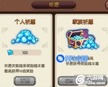 家族祈愿分为两种,但是每天只可以点一次,其中家族豪华祈愿不止自己获益,家族的每位成员也能感受到你的关爱哦