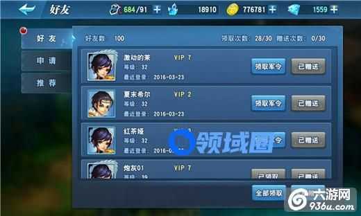 点击领取军令按钮可以领取好友赠送的军令,点击全部领取按钮可以一键领取所有好友赠送的军令且不能超过当日领取上限。