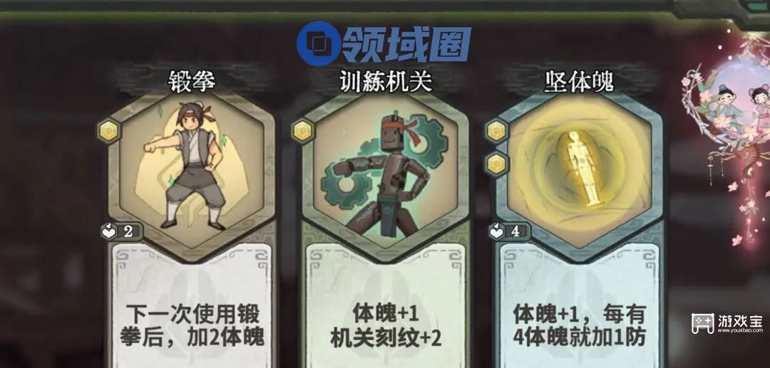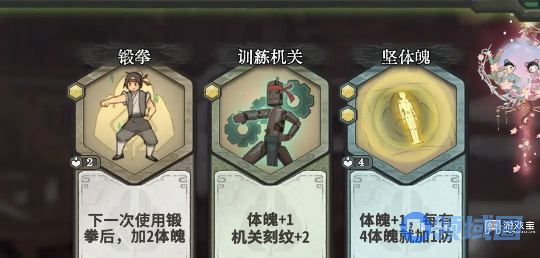 首先是体魄刻印,有锻拳的话,并且前面就给双锻拳刻印的话可以使用锻拳来一张卡补玩体魄,然后是训练机关,额外的体魄不用多说。