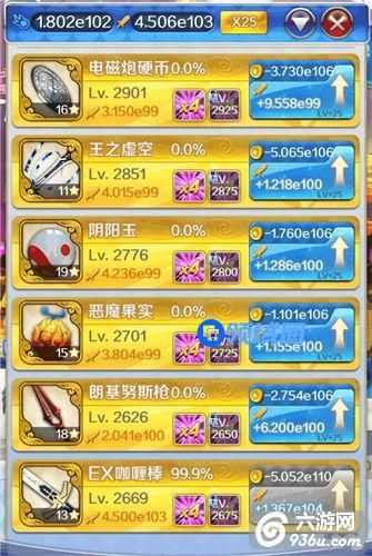 先讲一讲宝具,一共有25个宝具,越是下面的宝具,攻击力越高,越优先升或者买,很多刚开始玩的萌新不知道,把金币花在了性价比低的宝具,导致攻击力上不去,关闯不过去。也有很多刚玩的认为下面的宝具太贵了,那是你还没有习惯这个游戏的单位,后面单位全是科学计数法10的几百次方的。