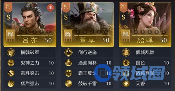 备注:兵种选择弓兵。依靠吕布弓形态稳定的连击率和兵种技能提供输出,董卓和貂蝉提供防御能力,该队伍对比骑吕会更不怕被集火。