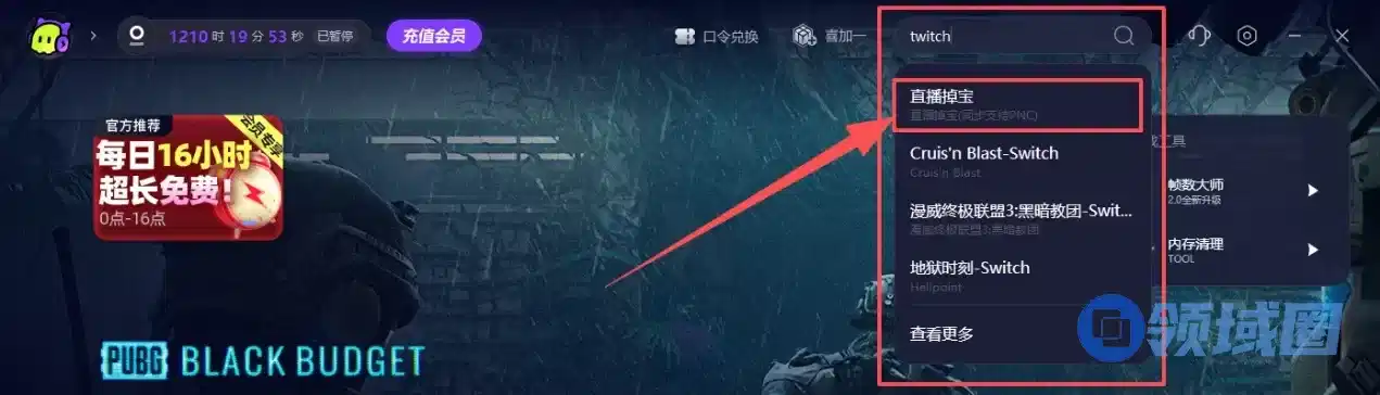 在加速器界面中搜索twitch/直播掉宝