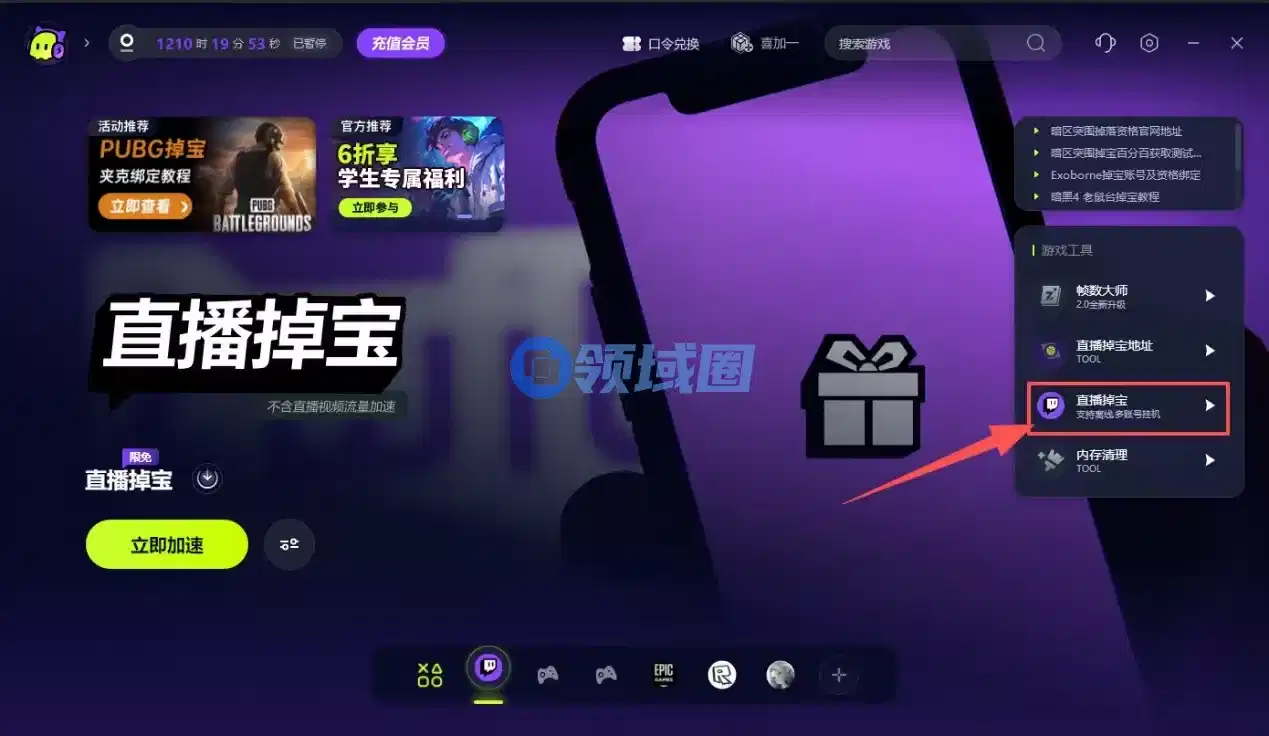 由于本次支持直播掉宝的平台不支持直接使用我们的家庭网络进行访问,所以推荐大家使用【古怪加速器】进行掉宝。