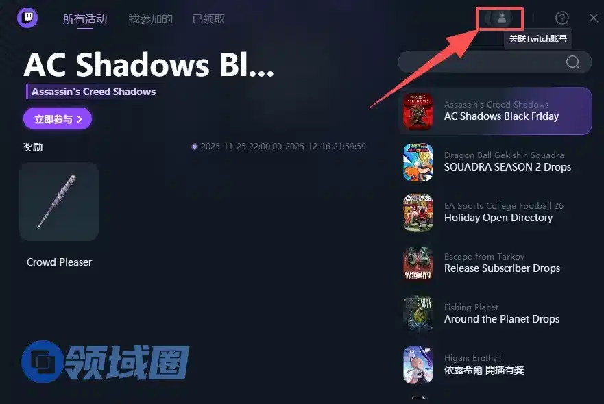 点击出来的小窗口右上角小头像,根据指示绑定自己的twitch账号,方便之后自动挂宝