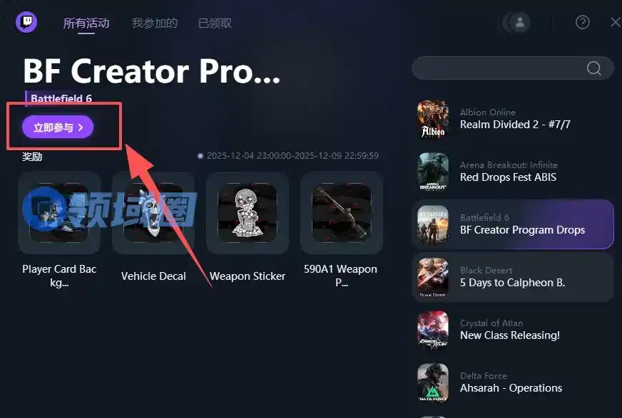等到掉宝活动开始之后,选择与PUBG黑域撤离相关的直播点击"立即参与"即可
