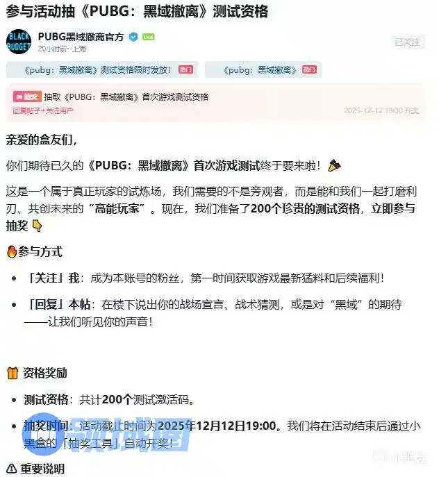 小黑盒直接搜《黑域撤离》官号里面抽资格,预计有200个名额,12号开奖