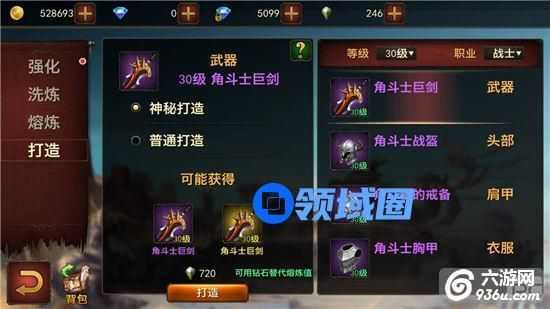 装备打造分为普通打造和神秘打造,普通打造每次刷新时会在当前等级段中抽取一件本职业装备,而神秘打造可能打造出紫色和金色装备。打造装备需要熔炼值,当熔炼值不够的时候,可用钻石代替哦(有钱真好~QAQ)。