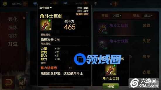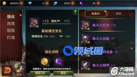 首先还是从头像下隐藏的菜单栏里点开装备按钮,很直观地看到《永恒》的装备系统下包含四部分:强化、洗练、熔炼和打造。所谓强化,也有升级的意味,就是把低级装备强化成高级装备,能使装备的基础属性得到直接提升。强化装备需要消耗金钱和强化石,钱都好说,强化石的获取就要下点功夫了,可以通过参加单人副本,守卫地牢等多人副本的方式获取,不过你要是有钱任性,直接用钻石购买最便捷了。