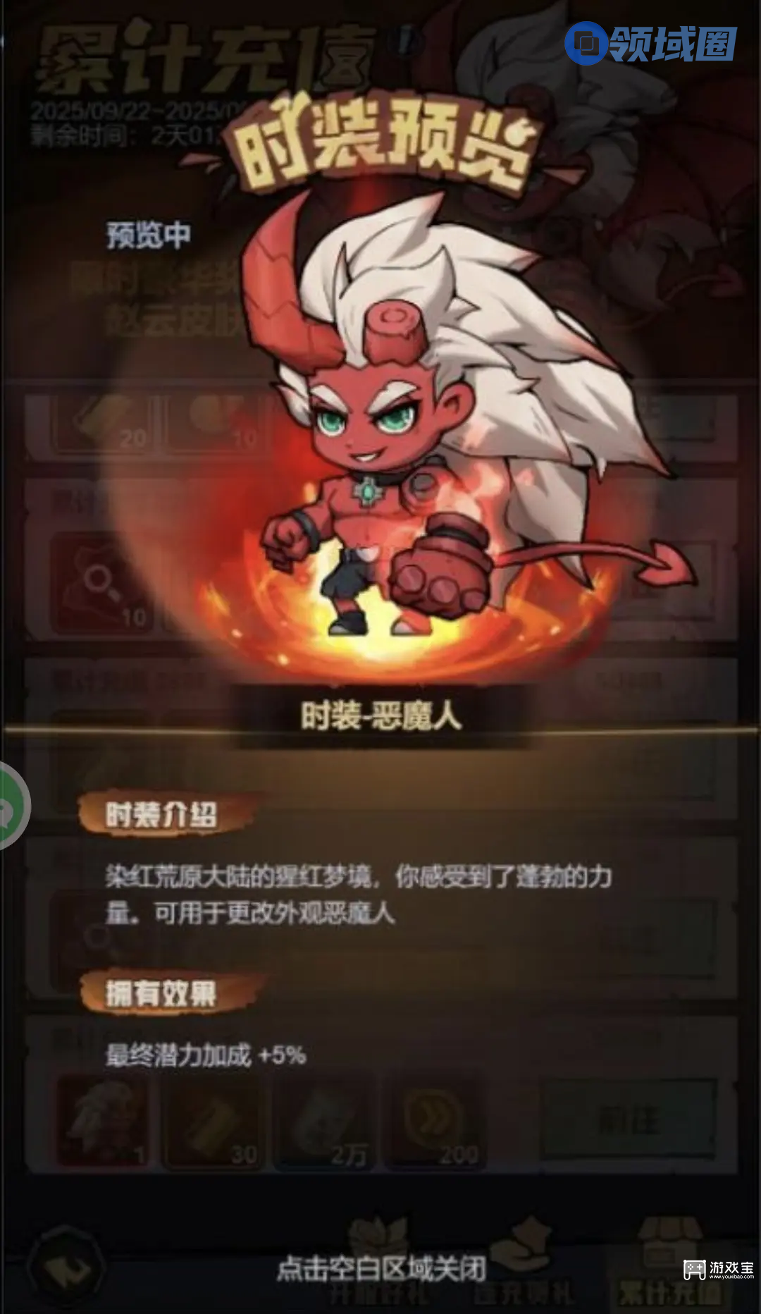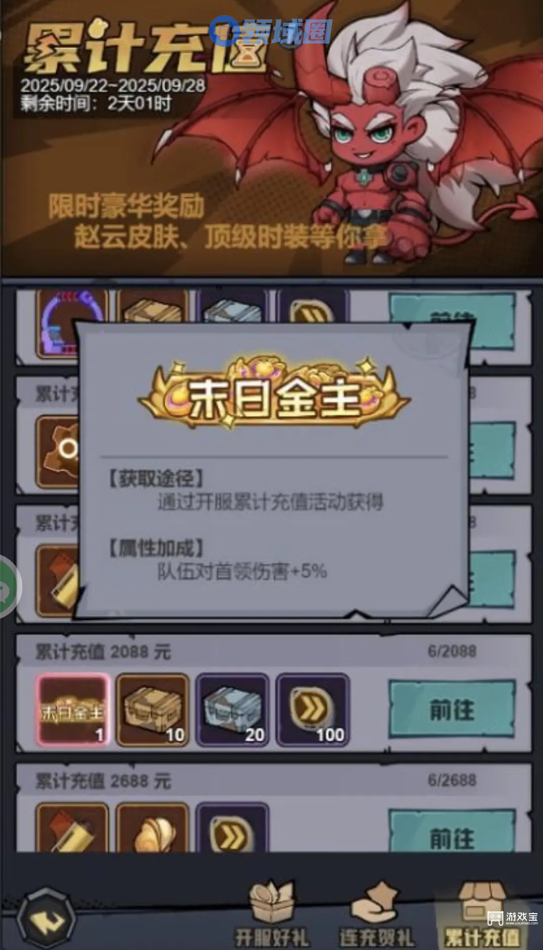第七天为开服累充活动最后一天,之后就没有开服累充活动了开服称号《末日金主》下线,开服时装《恶魔人》下线。
