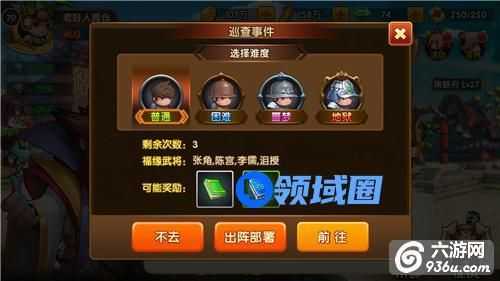 民事巡查副本每天可以触发三次,触发之后分可分为普通、困难、噩梦、地狱四个级别,玩家可手动选择关卡难度,当然难度越高获得收益越高。开启民事巡查副本后,点击“出阵部署”选择界面推荐的福缘武将上阵,不仅通关效益高,还有可能获得更高的奖励。不过大家要记得每天及时上线清理民事任务,这样才能获得稳定且高昂的回报。