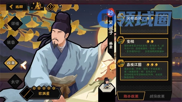 在无悔华夏游戏中,吴道子是新的空降妙级名臣,部分玩家不知道吴道子的剧本政策、战役政策和太守效果分别是什么,下面就为大家带来无悔华夏中吴道子剧本政策及太守效果的介绍说明,一起来看看吧!